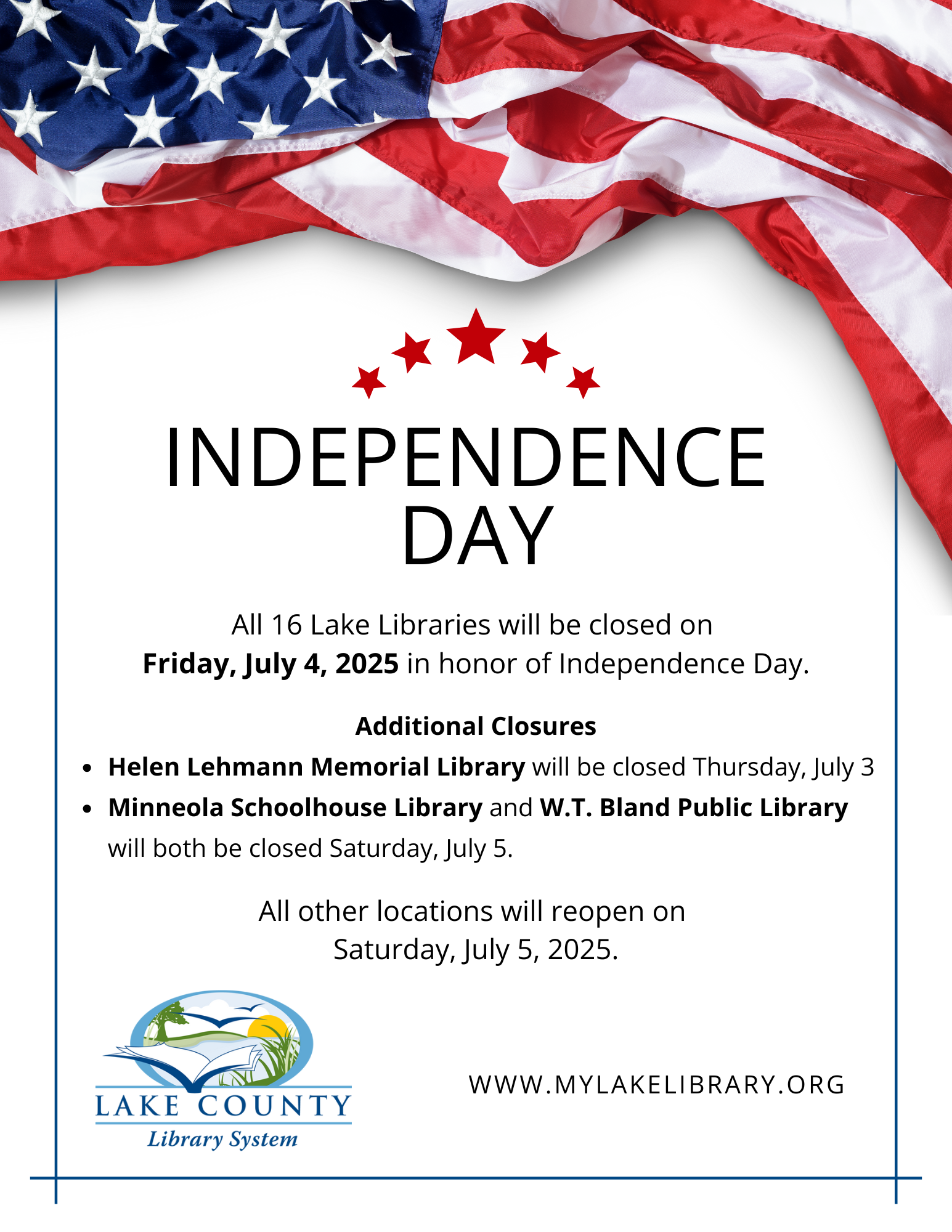All 16 Lake County libraries will be closed on Friday, July 4, 2025, in observance of Independence Day.