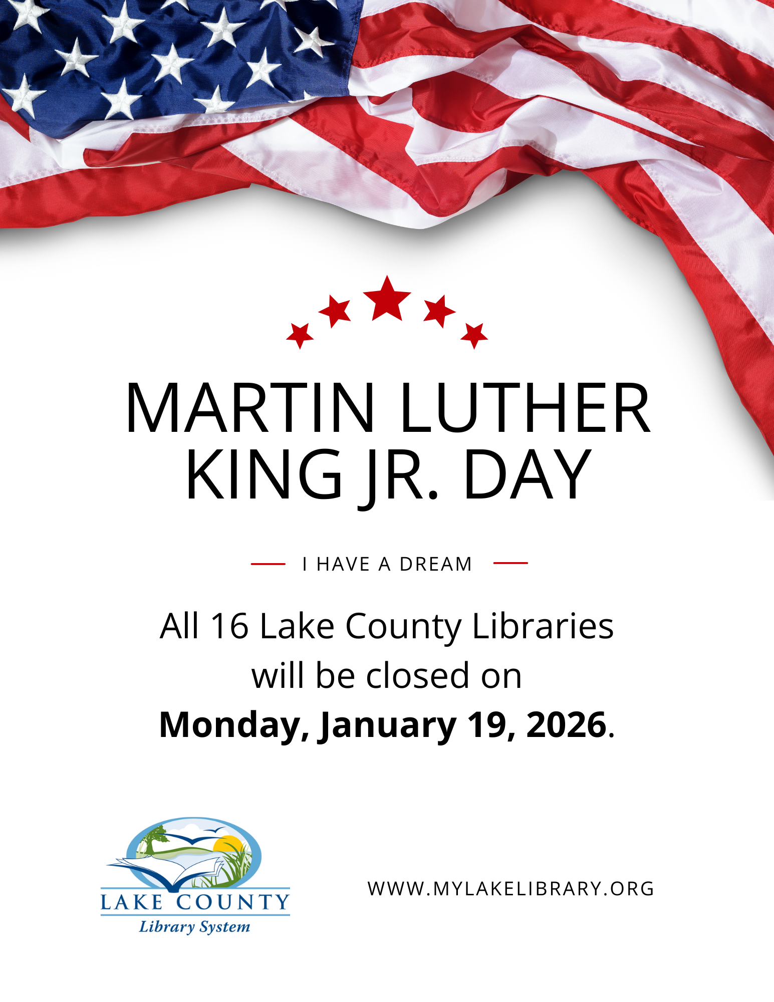 All 16 Lake County libraries will be clsoed on Monday, January 19, 2026, in honor of Martin Luther King Jr. Day. Libraries will reopen with regularly scheduled hours on Tuesday, January 20.